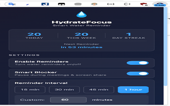 HydrateFocus is een handige Chrome-extensie die gebruikers herinnert om voldoende water te drinken. Deze gratis tool is ontworpen om automatisch vergaderingen te detecteren op platforms zoals Google Meet, Zoom en Teams. Hierdoor worden herinneringen om te drinken op een slimme manier vertraagd, zodat ze geen onderbreking vormen tijdens belangrijke momenten. De extensie helpt gebruikers om hun hydratatieniveaus te verbeteren zonder afleiding te veroorzaken tijdens werk of vergaderingen.
